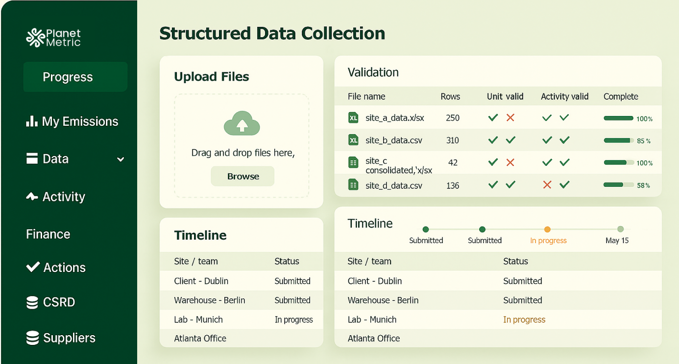 Planet Metric simplifies emissions data collection with configurable templates and validation workflows across departments.