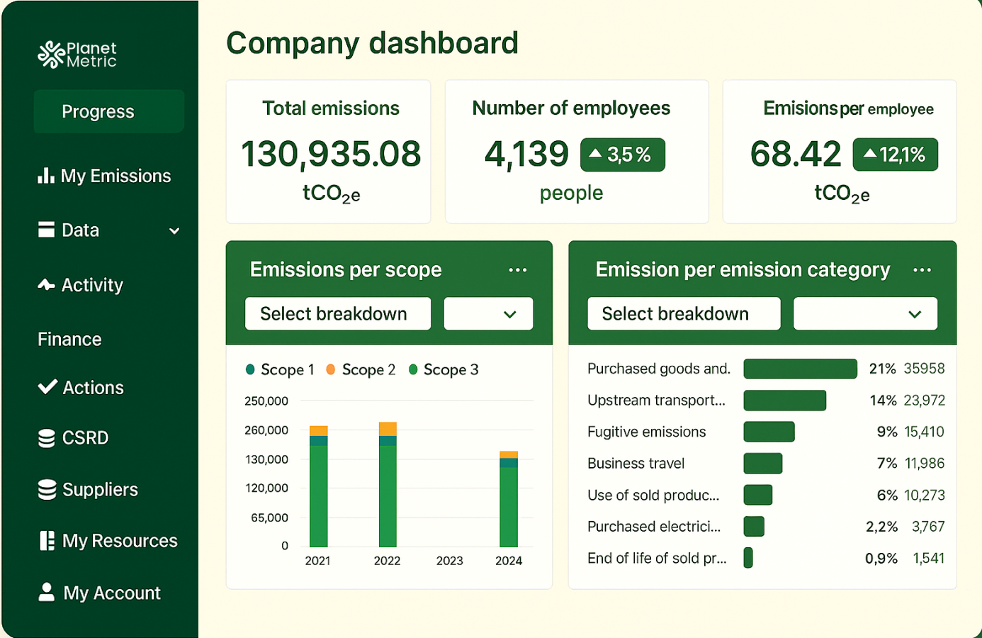 Track and manage Scope 1, 2, and 3 emissions with pre-built templates, editable emission factors, and real-time dashboards. Planet Metric helps you simplify carbon calculations, ensure auditability, and stay aligned with evolving ESG regulations.